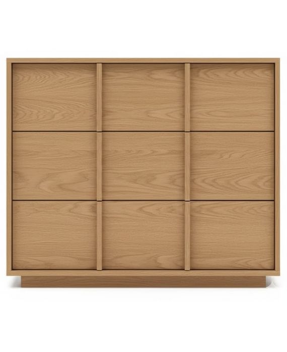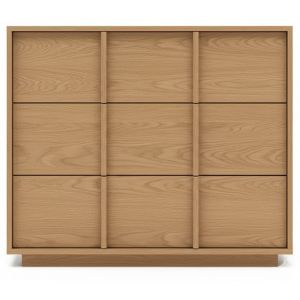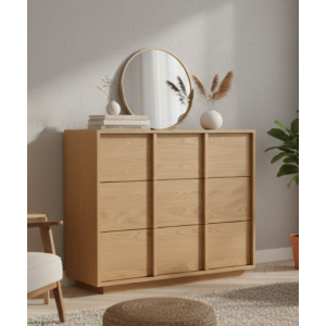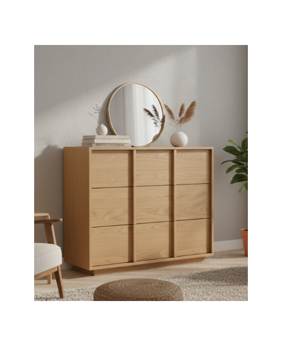 Cómoda fabricada íntegramente en madera chapada, con líneas rectas y amplios cajones. Diseño moderno y natural, personalizable en tonos y medidas.