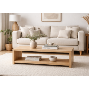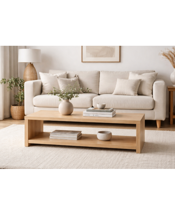 Mesa de centro 100 % madera con diseño minimalista y proporciones robustas. Disponible en varias medidas y acabados personalizados