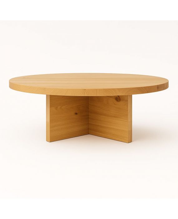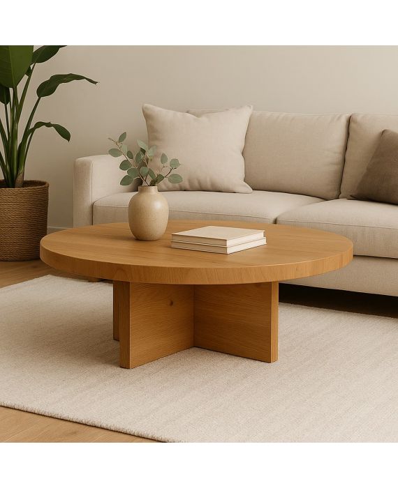 Mesa de centro redonda con tapa en chapa de roble natural de 40 mm. Diseño elegante y contemporáneo, disponible en varios diámetros. Perfecta para salones modernos o de estilo natural.