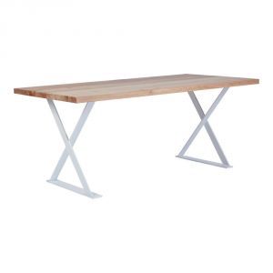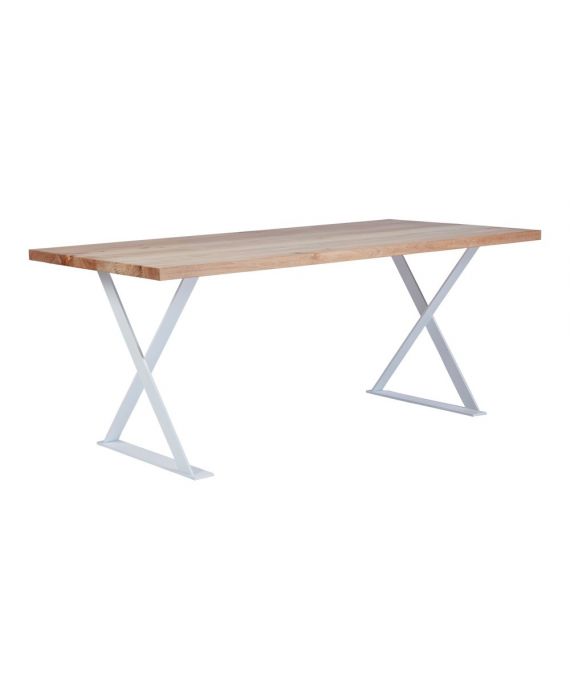 Mesa de comedor con base metálica en forma de aspa (X) y tapa personalizable en madera, mármol o cristal. Diseño industrial elegante y artesanal.