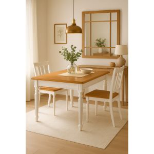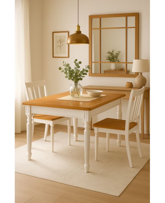 Encimera de pino natural · Patas torneadas estilo isabelino · Altura estándar: 76 cm · Opciones fija o extensible con apertura tipo libro · Medidas de 120×80 a 160×90 cm · Fabricada artesanalmente...