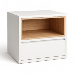 Fabricada en una combinación de estructura lacada y detalles en chapa roble , esta mesita de noche aporta un diseño limpio y funcional con un hueco abierto...