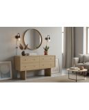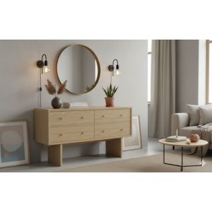 Está fabricada en chapa roble, aportando calidez, resistencia y una estética natural que encaja fácilmente en distintos ambientes. Los cajones cuentan con sistema de apertura hidráulica con cierre amortiguado, garantizando un uso suave, silencioso y cómodo, mientras que los tiradores aportan un toque clásico y elegante al conjunto.