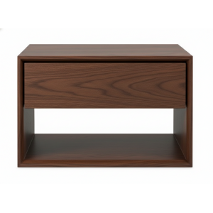 Está fabricado en chapa roble, aportando calidez y una estética natural, y dispone de cajón con sistema push to open y cierre amortiguado, que garantiza un uso cómodo y silencioso sin necesidad de tiradores visibles. Sus medidas de 100 x 100 cm lo hacen ideal para aprovechar el espacio sin sobrecargar el ambiente.