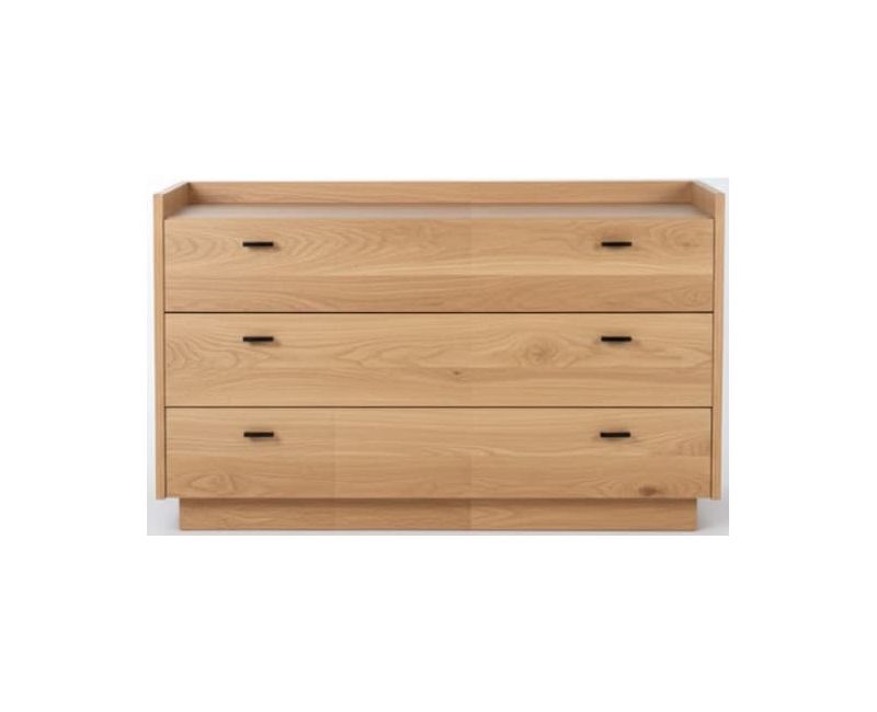 Cómoda de 3 cajones con apertura hidráulica y cierre amortiguado, fabricada a medida en chapa roble. Diseño elegante con estructura ligera y proporciones equilibradas. Se sirve montada y con portes incluidos.