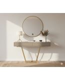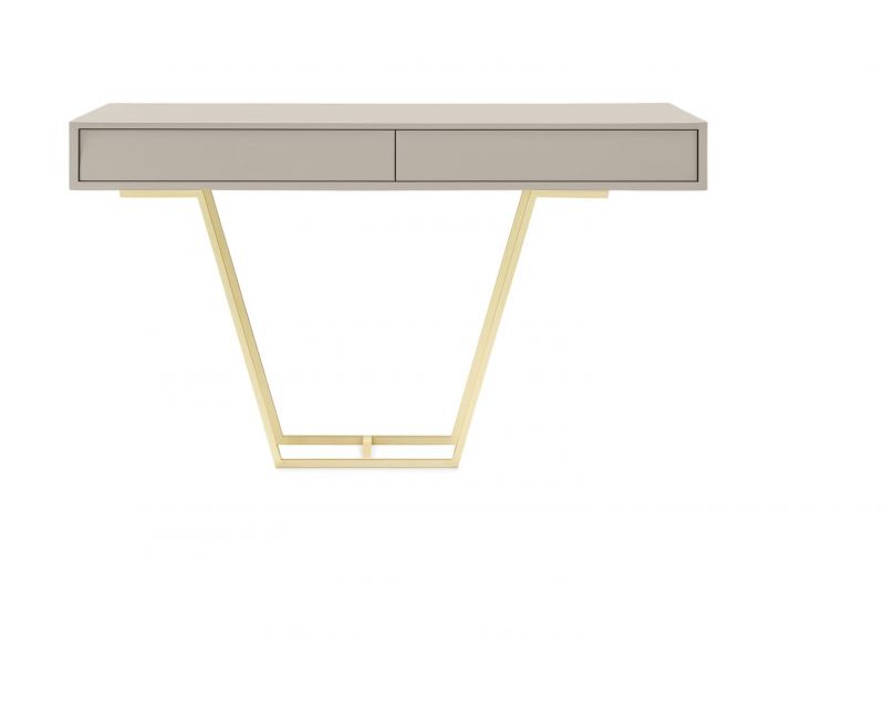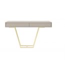 La consola INES destaca por su diseño ligero y una estructura metálica en forma de “V” que aporta una presencia visual muy equilibrada. El módulo superior está fabricado en chapa de roble, ofreciendo una superficie resistente y uniforme que integra dos cajones amplios para almacenar objetos de uso diario.