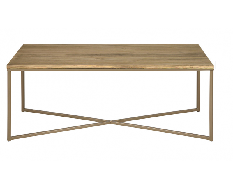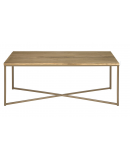 Mesa de centro con tapa en chapa de roble natural y estructura metálica en forma de cruz. Diseño moderno y personalizable en medidas y acabados.
