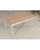 Su tapa en chapa de roble natural aporta calidez y textura, mientras que la estructura de hierro tubular 20×20 mm, dispuesta en forma de cruz, proporciona estabilidad y carácter industrial.