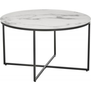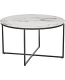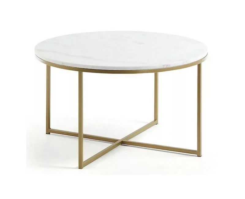 Mesa de centro redonda con tapa de mármol natural y base de hierro personalizable. Disponible en varios diámetros, ideal para salones modernos y elegantes.