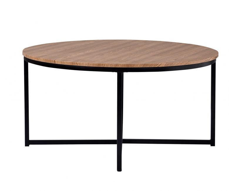 Mesa de centro con tapa en chapa de roble natural y estructura metálica. Diseño redondo, moderno y personalizable en medidas y colores.