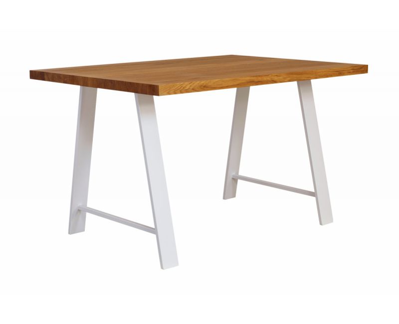 Encimera en chapa de roble natural · Estructura metálica de hierro · Altura estándar: 75 cm · Medidas disponibles: 100×100 a 200×100 cm · Acabados personalizables · Diseño industrial robusto