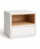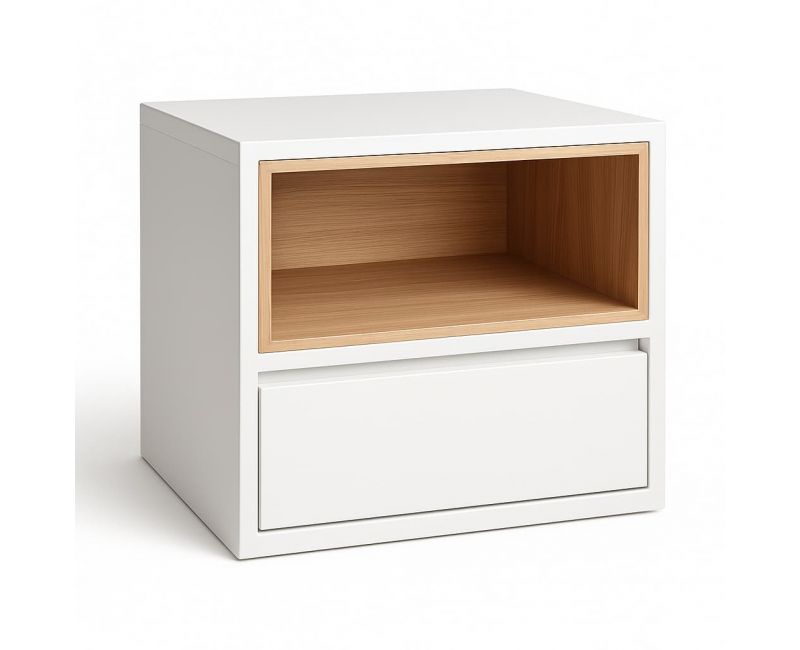 Fabricada en una combinación de estructura lacada y detalles en chapa roble, esta mesita de noche aporta un diseño limpio y funcional con un hueco abierto superior y un cajón inferior muy práctico. El cajón incorpora sistema push to open y cierre amortiguado, ofreciendo una apertura suave y cómoda.