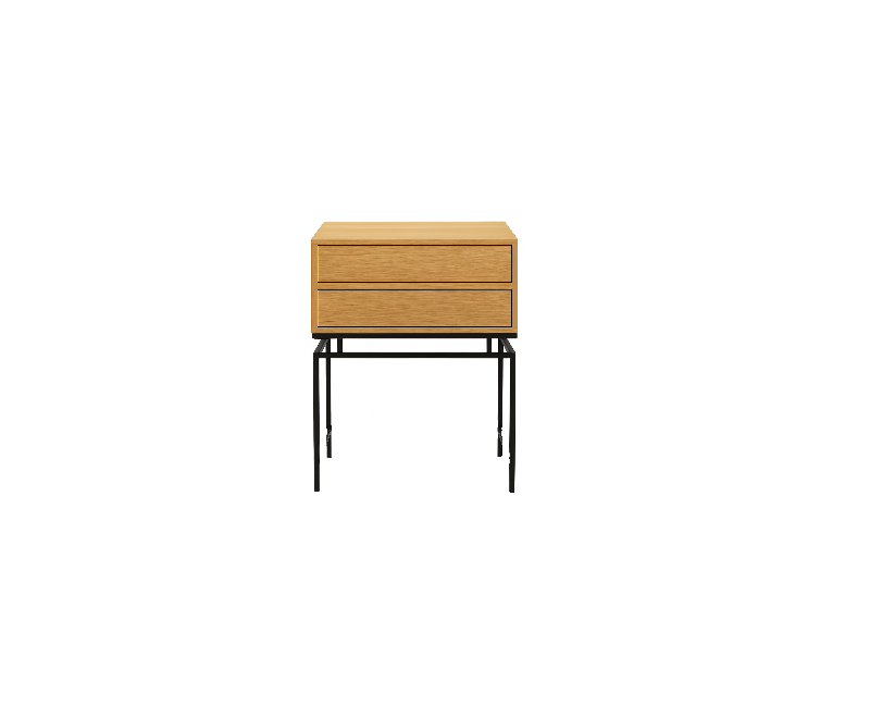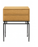 La mesita de noche AUREN 2C combina una estructura ligera de hierro pintado en tren de pintura y secado al horno con un módulo superior en chapa roble de líneas rectas y modernas.