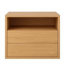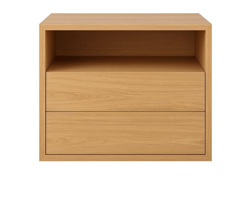 Su estructura compacta integra dos cajones inferiores amplios y una balda abierta superior que resulta perfecta para colocar libros, cargadores u objetos de uso diario. Su formato cuadrado y su superficie superior lisa permiten combinarla fácilmente con cualquier cabecero o conjunto de dormitorio.