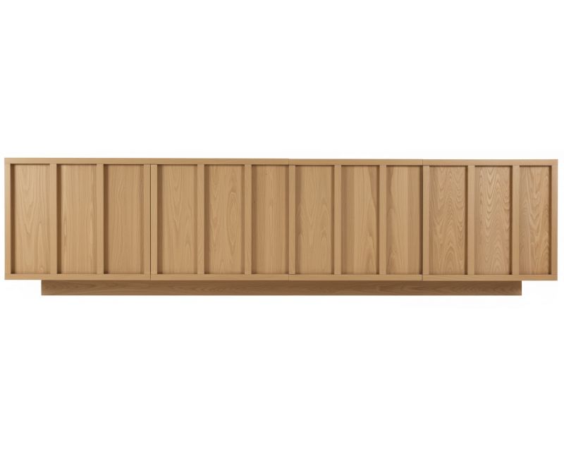 Fabricado en chapa roble, este modelo resalta la veta natural de la madera, aportando calidez y carácter al espacio. El mueble descansa sobre un zócalo integrado, que refuerza la sensación de solidez y continuidad visual, manteniendo el conjunto compacto y equilibrado.