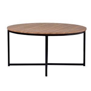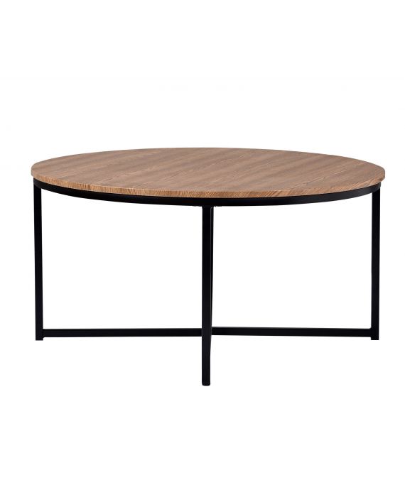 Mesa de centro con tapa en chapa de roble natural y estructura metálica. Diseño redondo, moderno y personalizable en medidas y colores.