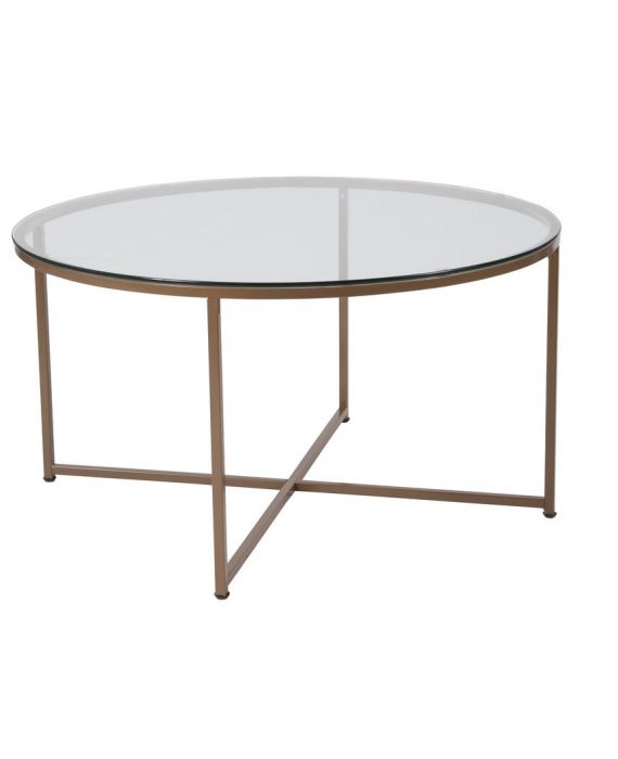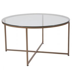 Mesa de centro redonda con tapa de cristal templado y estructura de hierro personalizable. Diseño moderno y ligero, disponible en varios tamaños.