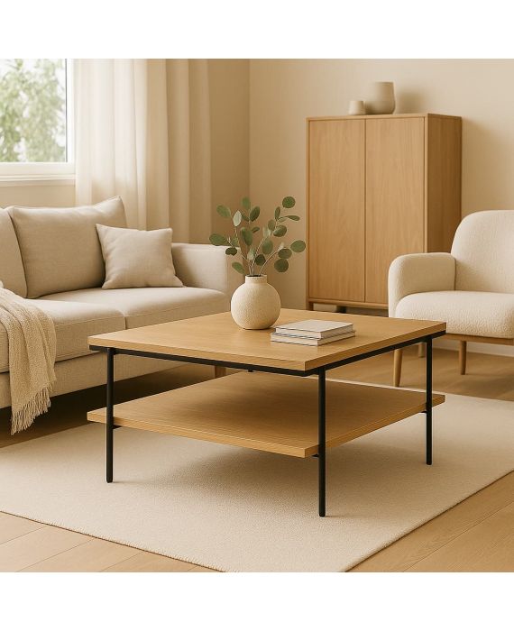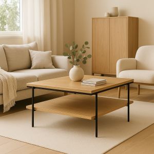 Mesa de centro de diseño actual con tapa de roble natural y estructura de hierro.