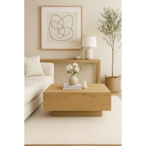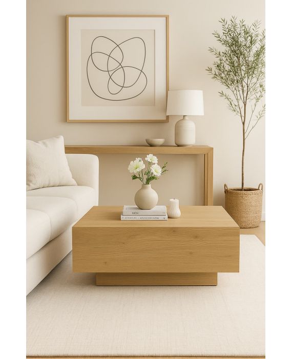 Mesa de centro fabricada en madera, con diseño cúbico minimalista. Disponible en diferentes acabados y medidas. Perfecta para salones modernos y espacios luminosos.